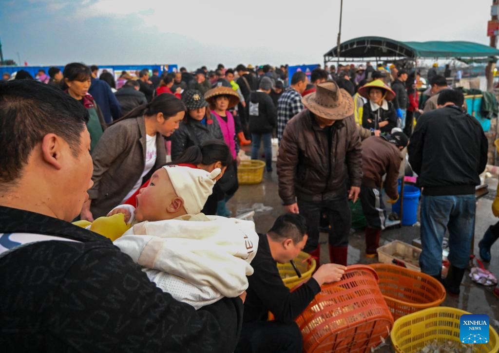 People buy seafood at the Bohe port in Maoming, south China's Guangdong Province, Jan. 29, 2026. As dawn breaks, the Bohe port in Maoming, south China's Guangdong Province, is already a bustling scene. Captain Huang Ningbo and his brother Huang Ninglang steer their fishing vessel, leading the crew to the sea for fishing operations.
