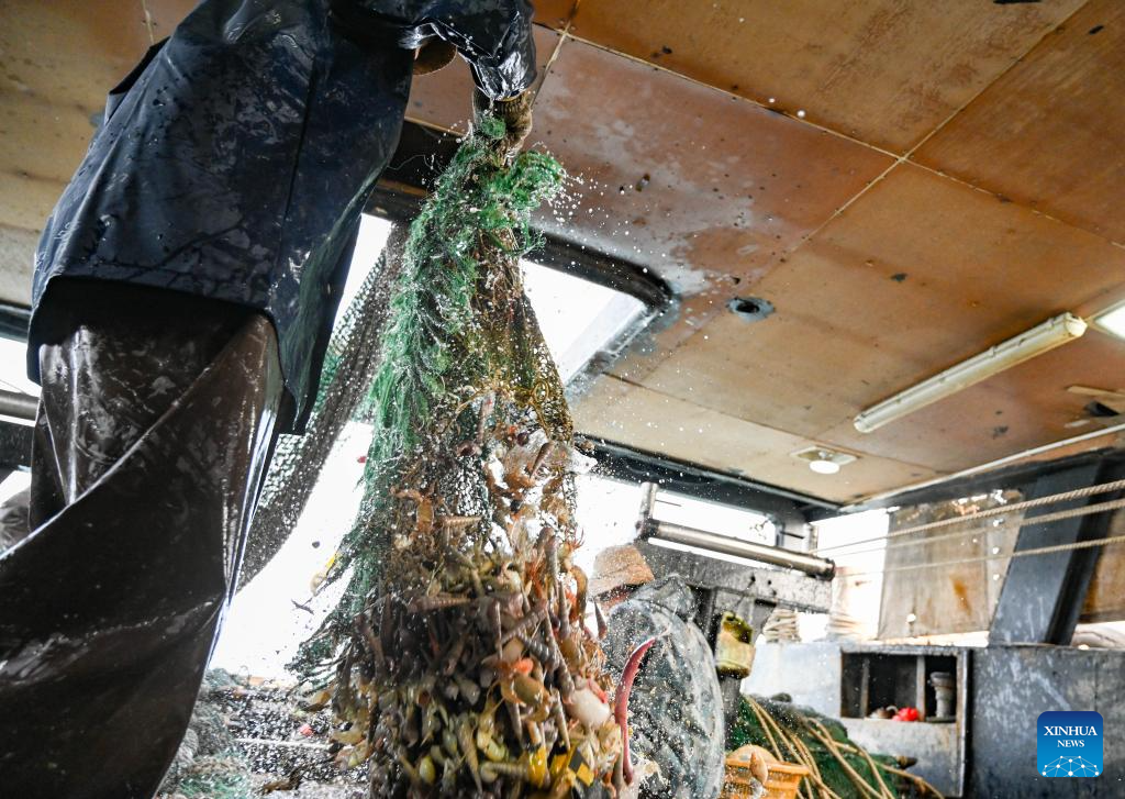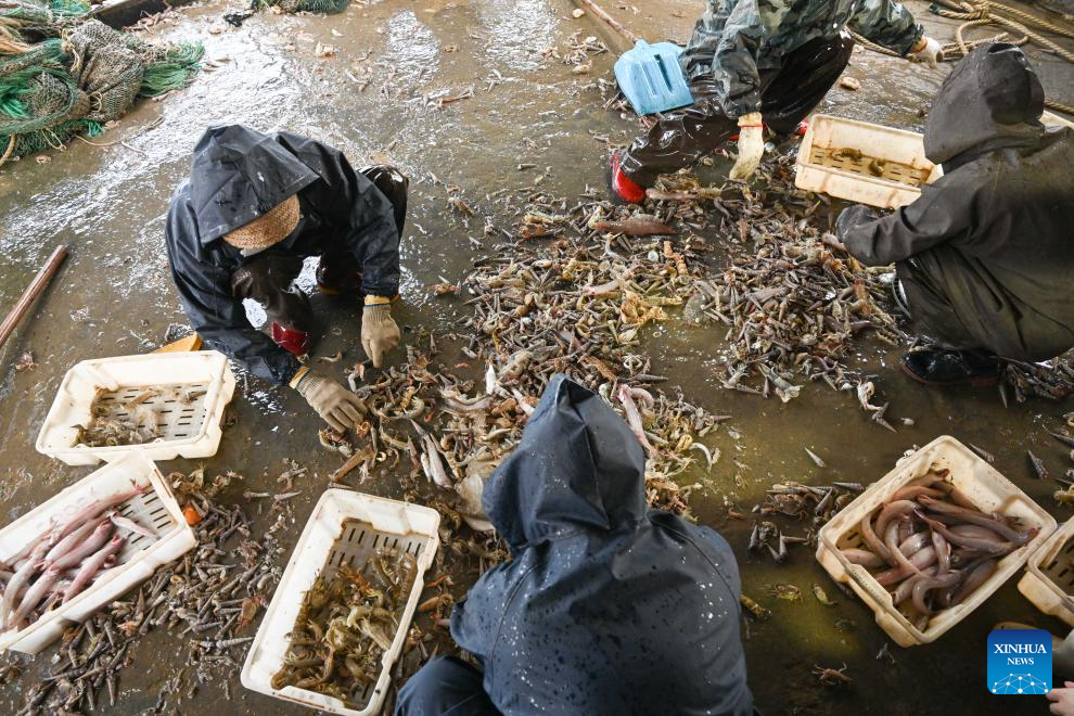 This photo taken on Jan. 28, 2026 shows the sorted-out catches at the vessel. As dawn breaks, the Bohe port in Maoming, south China's Guangdong Province, is already a bustling scene. Captain Huang Ningbo and his brother Huang Ninglang steer their fishing vessel, leading the crew to the sea for fishing operations.