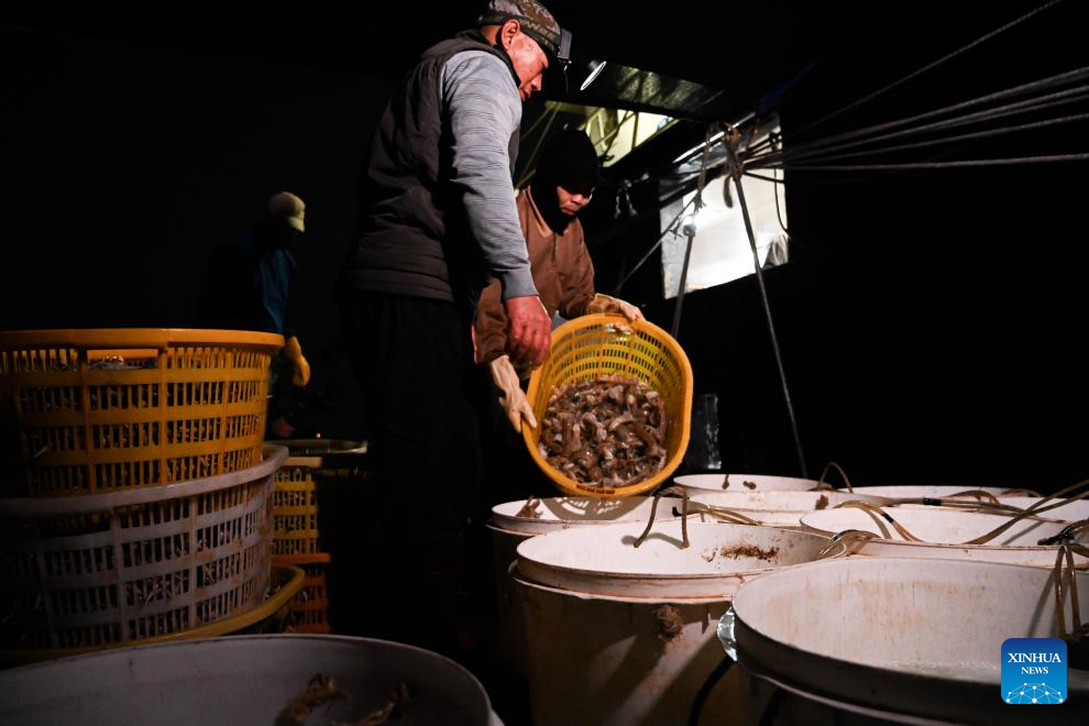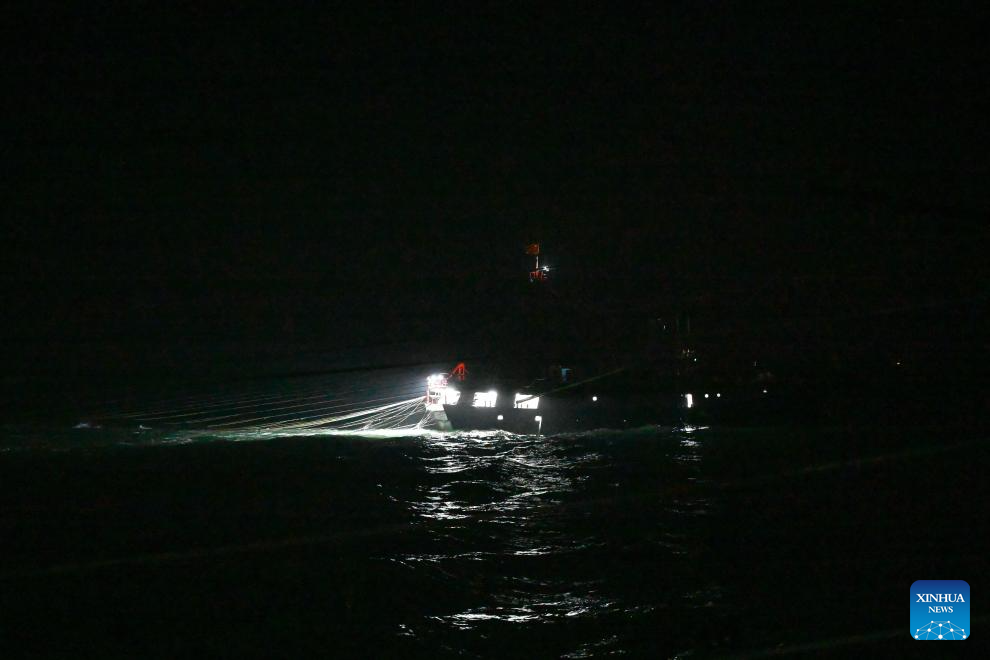 Crew members operate at night at the vessel on Jan. 28, 2026. As dawn breaks, the Bohe port in Maoming, south China's Guangdong Province, is already a bustling scene. Captain Huang Ningbo and his brother Huang Ninglang steer their fishing vessel, leading the crew to the sea for fishing operations.