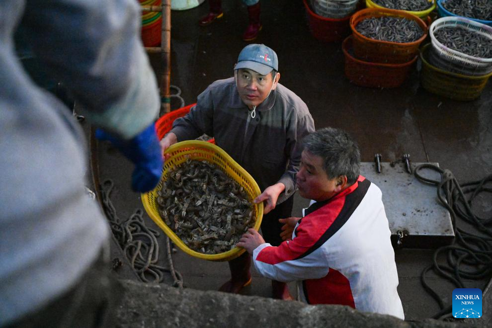 Crew members transfer the catches from a shuttle boat at the Bohe port in Maoming, south China's Guangdong Province, Jan. 29, 2026. As dawn breaks, the Bohe port in Maoming, south China's Guangdong Province, is already a bustling scene. Captain Huang Ningbo and his brother Huang Ninglang steer their fishing vessel, leading the crew to the sea for fishing operations.