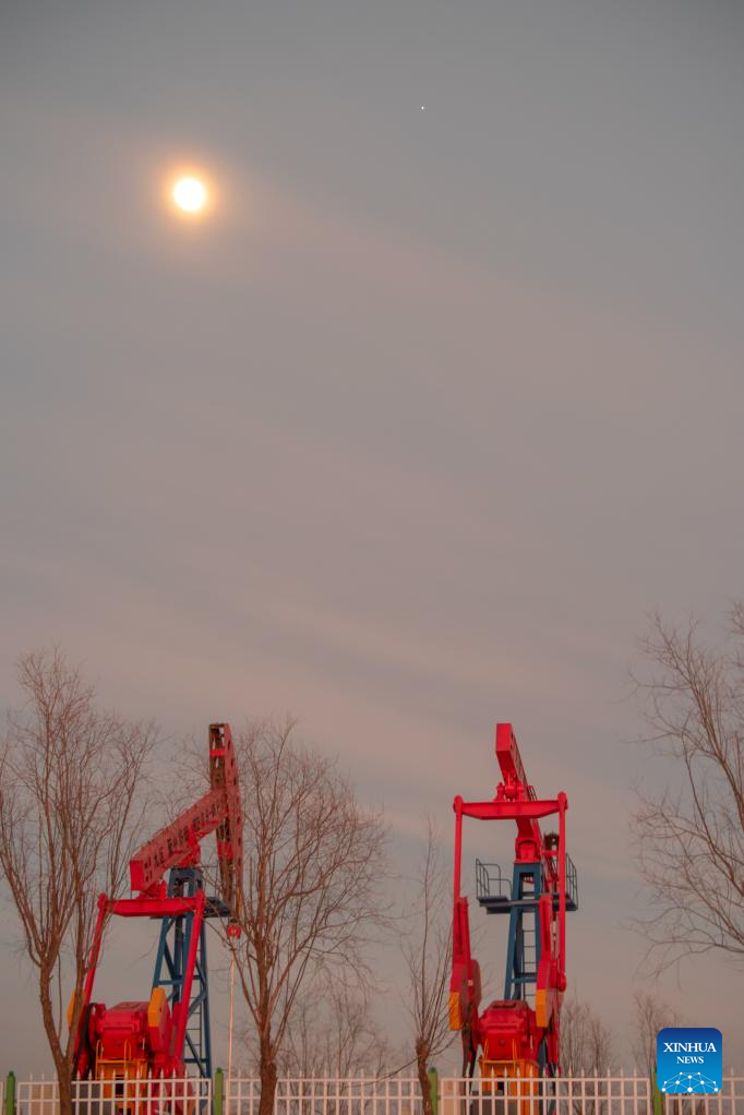 This photo taken on Jan. 31, 2026 shows a conjunction of Jupiter and the waxing gibbous moon over the sky of Daqing City, northeast China's Heilongjiang Province. A conjunction of Jupiter and the waxing gibbous moon appeared over the sky on Saturday. (Photo by Liu Wei/Xinhua)