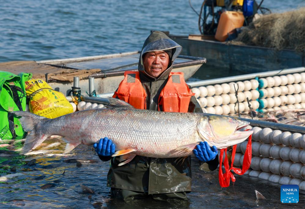A fisherman displays a freshly caught fish during a winter fishing event in Taizhou, east China's Jiangsu Province, Jan. 31, 2026. (Photo by Gu Jihong/Xinhua)