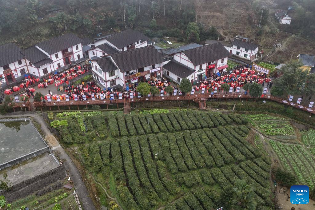 This aerial drone photo taken on Feb. 1, 2026 shows a banquet held during the Spring Festival gala in Shenshan Village, Jinggangshan City of east China's Jiangxi Province. With the Spring Festival drawing near, Shenshan Village in Jinggangshan City held a Spring Festival gala that invited residents from seven nearby counties in east China's Jiangxi and central China's Hunan provinces to participate. (Xinhua/Zhou Mi)