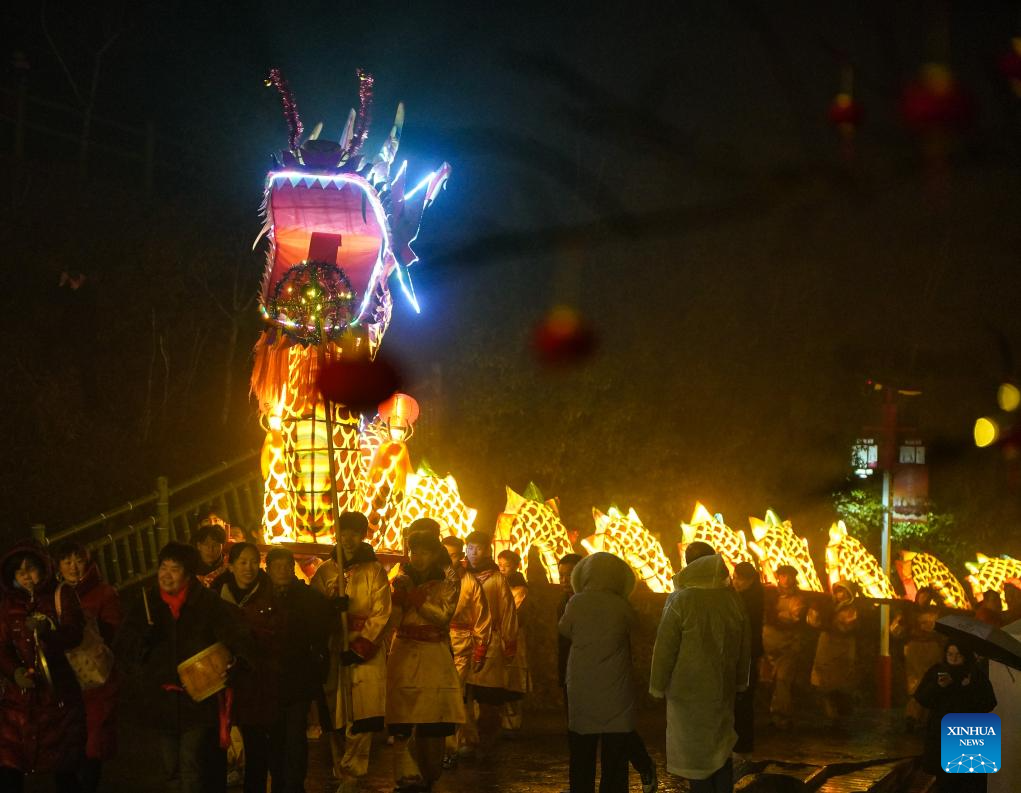 A wooden-bench dragon dance is performed during the Spring Festival gala held in Shenshan Village, Jinggangshan City of east China's Jiangxi Province, Jan. 31, 2026. With the Spring Festival drawing near, Shenshan Village in Jinggangshan City held a Spring Festival gala that invited residents from seven nearby counties in east China's Jiangxi and central China's Hunan provinces to participate. (Xinhua/Zhou Mi)