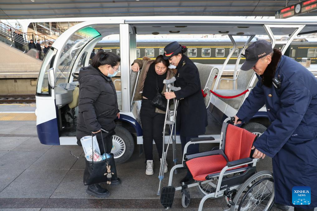 Staff members help a passenger at Beijing Railway Station in Beijing, capital of China, Feb. 2, 2026. China ushered in its largest annual population migration on Monday, 15 days ahead of the 2026 Spring Festival, also known as the Chinese New Year.