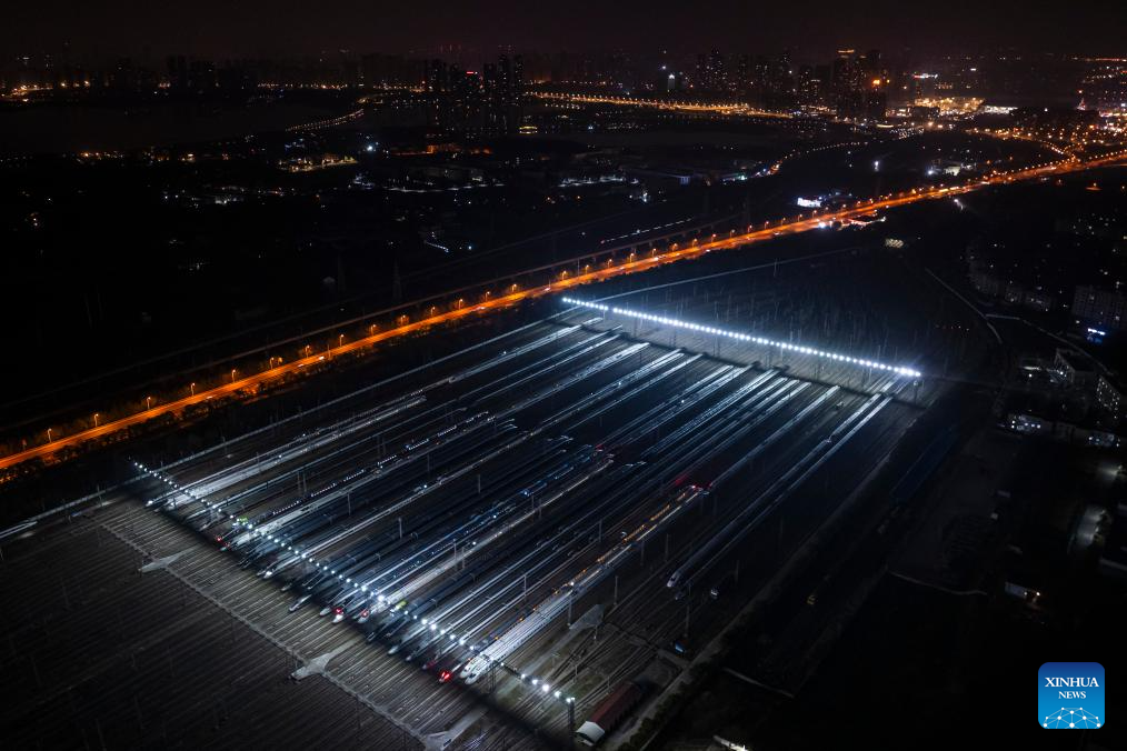 An aerial drone photo taken on Feb. 1, 2026 shows high-speed trains at a train depot in Wuhan, central China's Hubei Province. (Xinhua/Wu Zhizun)