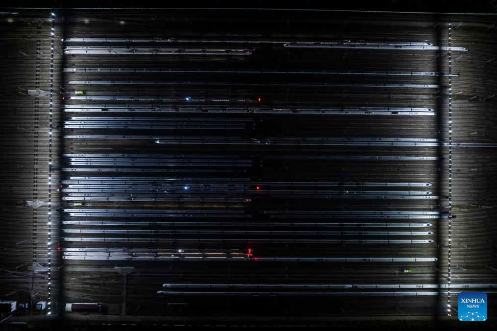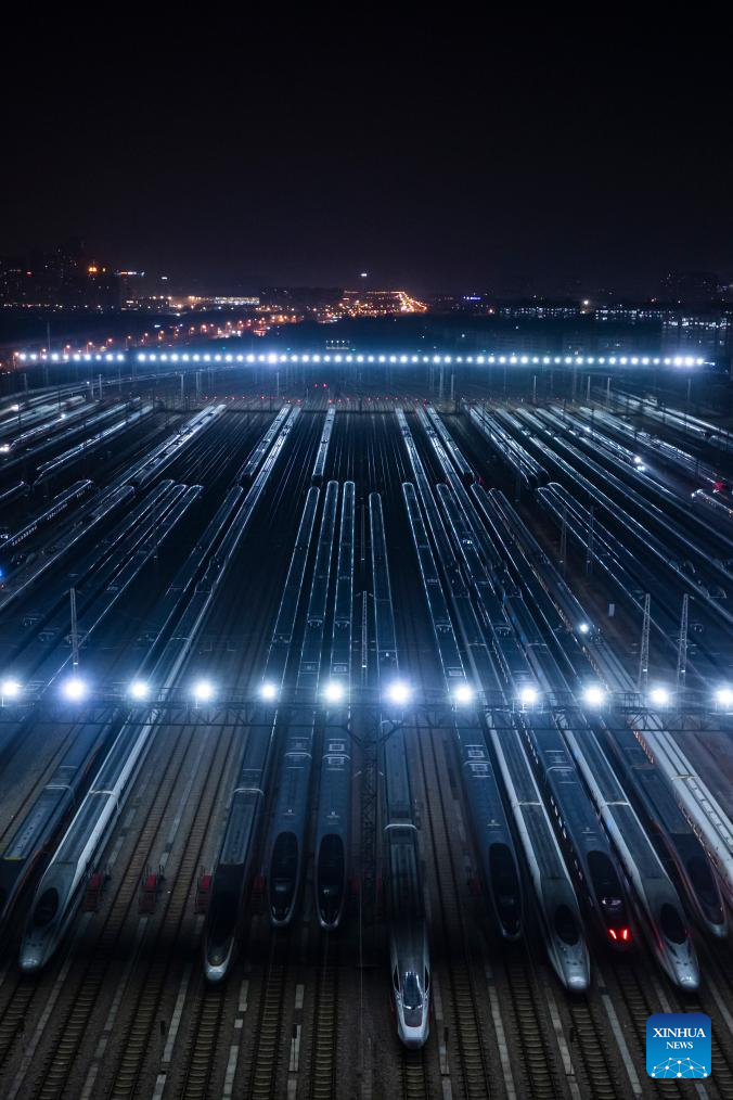 An aerial drone photo taken on Feb. 1, 2026 shows high-speed trains at a train depot in Wuhan, central China's Hubei Province.(Xinhua/Wu Zhizun)