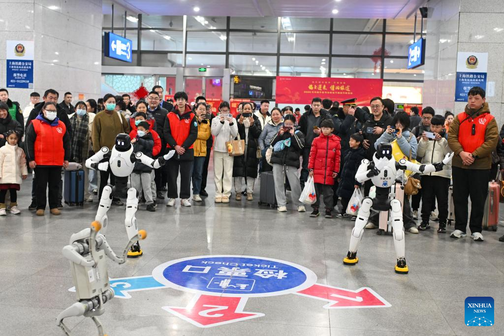 Passengers watch a robot performance at Hefei South Railway Station in Hefei, east China's Anhui Province, Feb. 2, 2026.