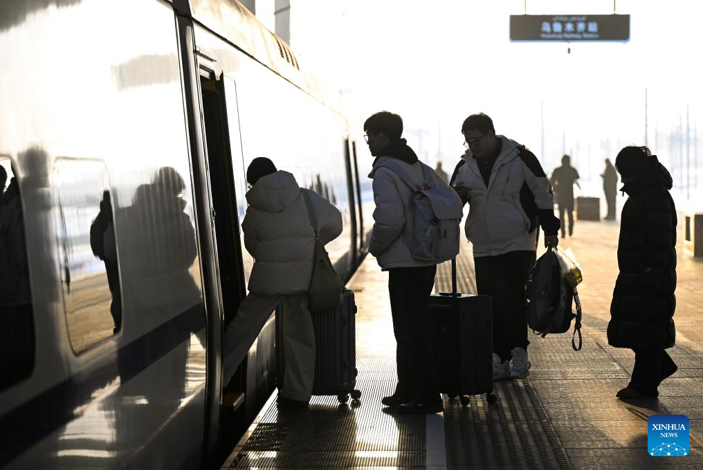 Passengers board a train at Urumqi Railway Station in Urumqi, northwest China's Xinjiang Uygur Autonomous Region, Feb. 2, 2026. China ushered in its largest annual population migration on Monday, 15 days ahead of the 2026 Spring Festival, also known as the Chinese New Year.