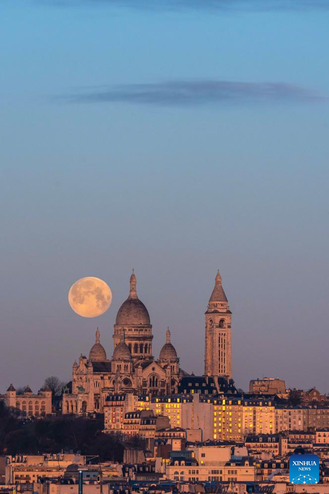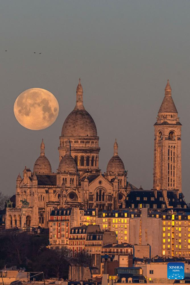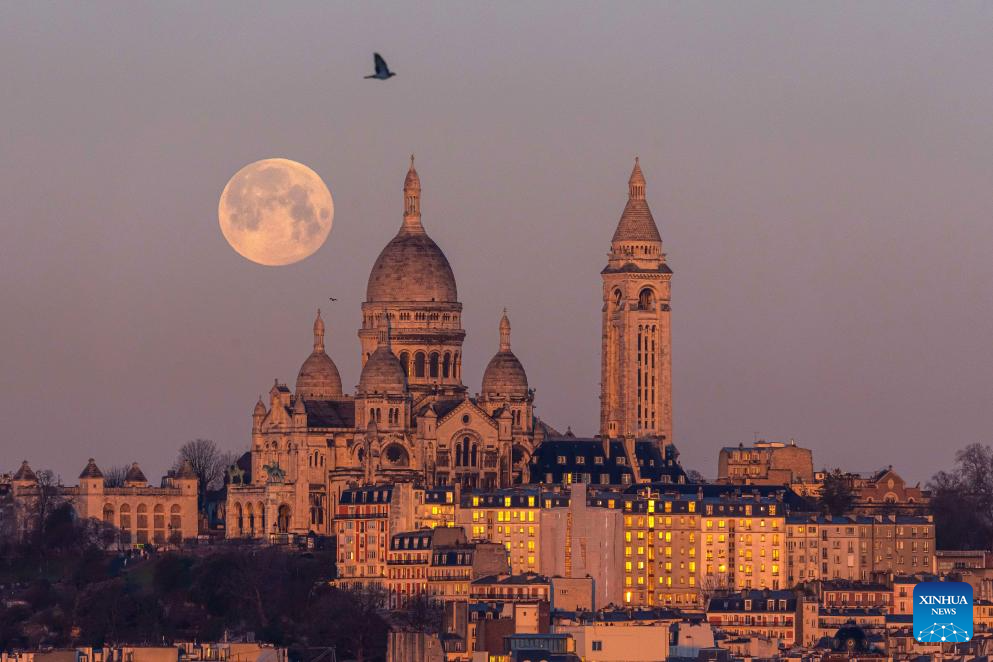 A full snow moon is seen next to the Sacre Coeur Basilica at sunrise in Montmartre, Paris, France, Feb. 2, 2026. (Photo by Aurelien Morissard/Xinhua)