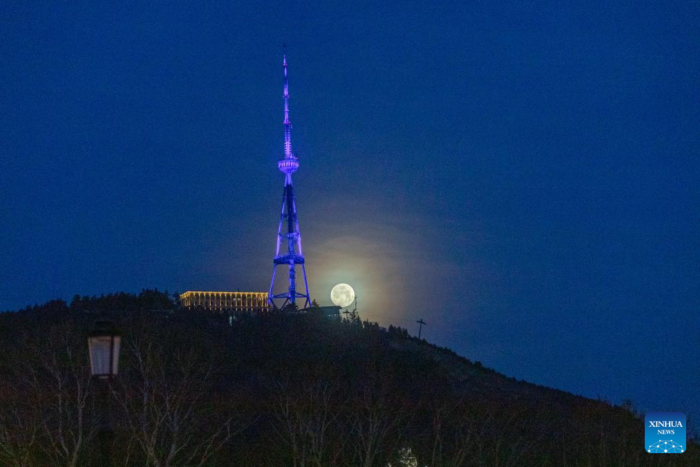 This photo taken on Feb. 2, 2026 shows a full moon near the TV tower in Tbilisi, capital of Georgia. (Xinhua/Chen Junfeng)