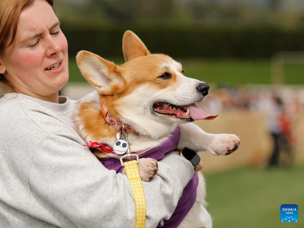 A corgi owner with her dog waits to attend a race during the Winter Corgi Nationals championship at Santa Anita Park in Arcadia, California, the United States, Feb. 15, 2026. (Photo by Qiu Chen/Xinhua)