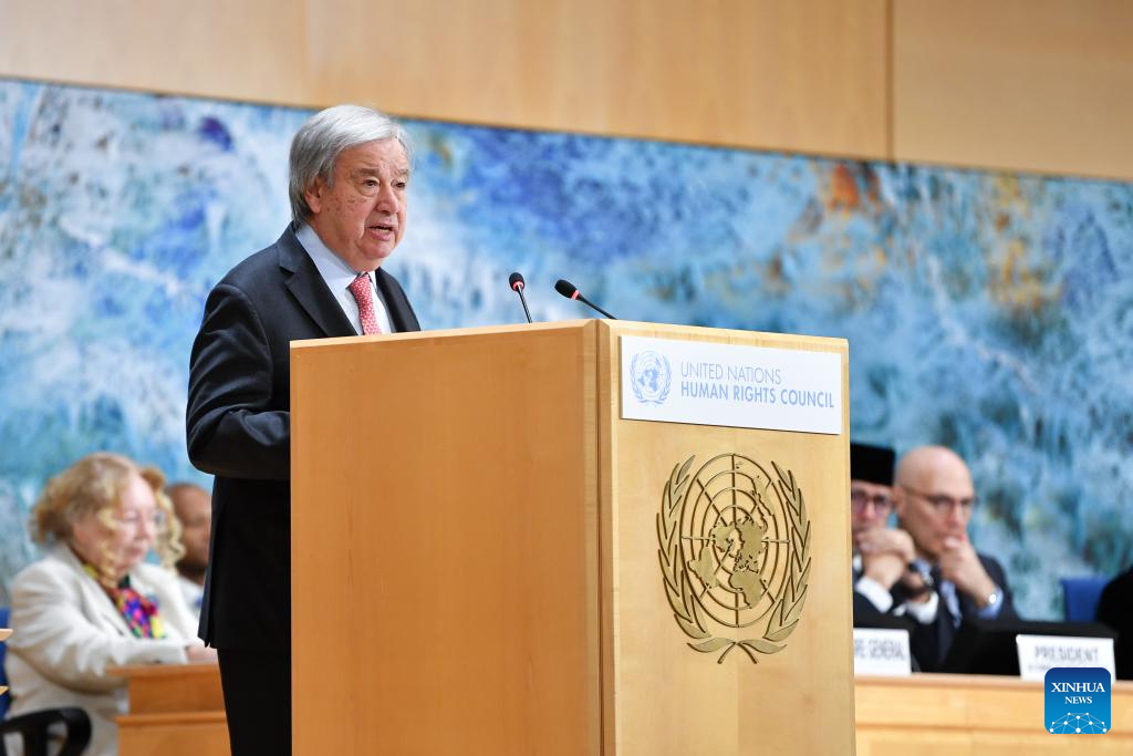 United Nations (UN) Secretary-General Antonio Guterres addresses the 61st session of the UN Human Rights Council at Palais des Nations in Geneva, Switzerland, Feb. 23, 2026. United Nations (UN) Secretary-General Antonio Guterres said on Monday that human rights, human dignity, and international law are being blatantly violated in areas affected by the Palestine-Israel conflict, and the two-state solution is "being stripped away." (Xinhua/Lian Yi)