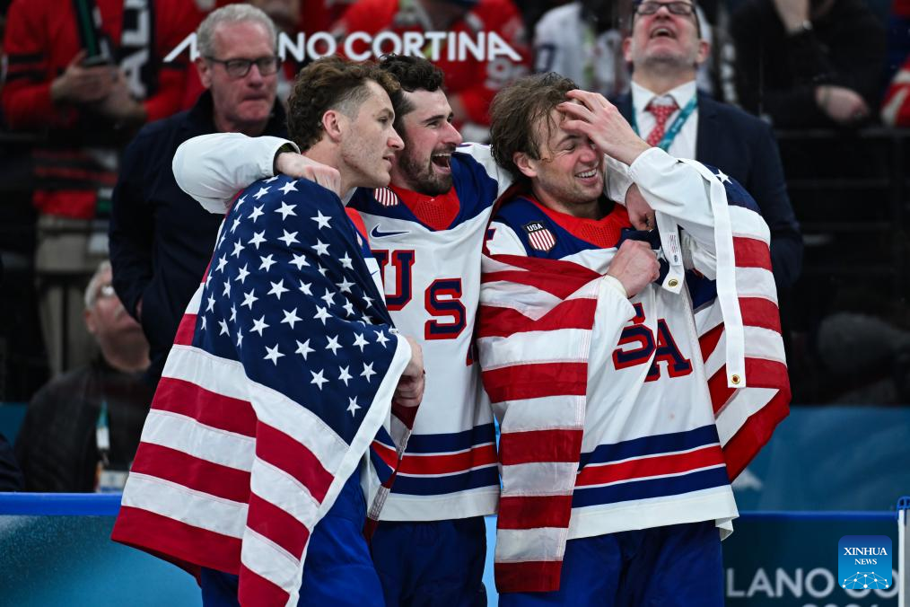 MILAN, Feb. 22 (Xinhua) -- The United States captured its third Olympic men's ice hockey gold medal, and first in 46 years, by edging Canada 2-1 in overtime in a thrilling final at the Milan-Cortina Winter Olympics on Sunday.