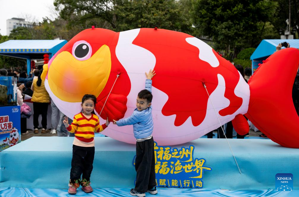 Children pose for photos with a goldfish-shaped balloon at a park in Fuzhou, southeast China's Fujian Province, Feb. 25, 2026. Fuzhou goldfish cultivation skills, a provincial intangible cultural heritage of Fujian, have been passed down generation after generation, gaining the goldfish variety global fame. (Xinhua/Wei Peiquan)