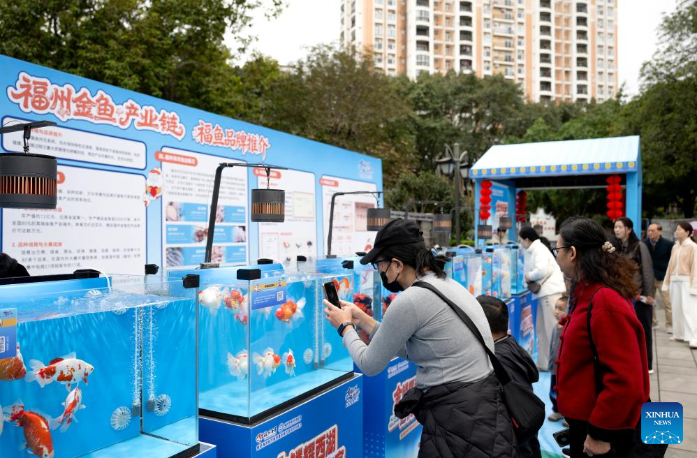 This photo taken on Feb. 25, 2026 shows goldfish displayed at a park in Fuzhou, southeast China's Fujian Province. Fuzhou goldfish cultivation skills, a provincial intangible cultural heritage of Fujian, have been passed down generation after generation, gaining the goldfish variety global fame. (Xinhua/Wei Peiquan)