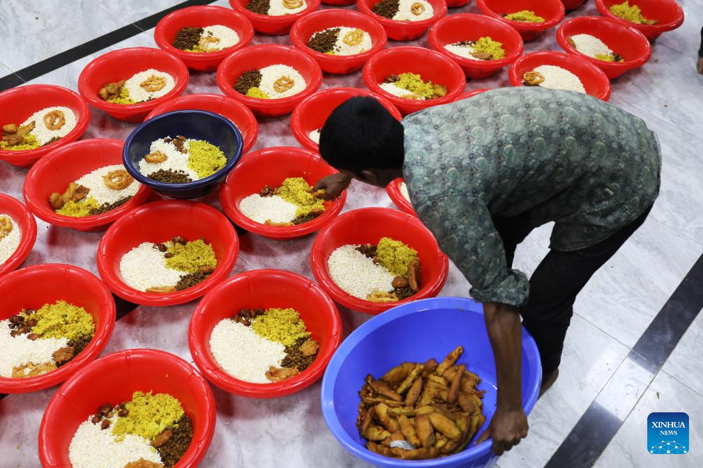 A volunteer prepares meals during Ramadan in Dhaka, Bangladesh, Feb. 24, 2026. (Photo by Habibur Rahman/Xinhua)