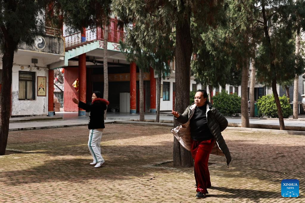 People practice Taijiquan, a kind of Chinese traditional martial arts, in Chenjiagou Village of Wenxian County, central China's Henan Province, March 19, 2026. (Xinhua/Ren Zhuoru)