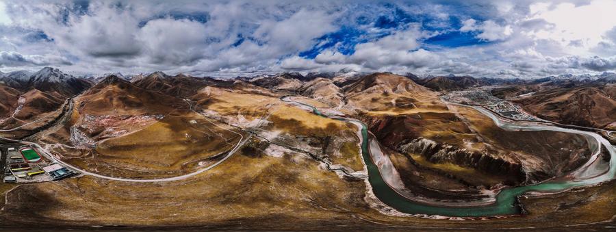 An aerial panoramic drone photo taken on Oct. 26, 2025 shows a view of the Lancang River in Zadoi County, northwest China's Qinghai Province. (Xinhua/Du Xiaowei)