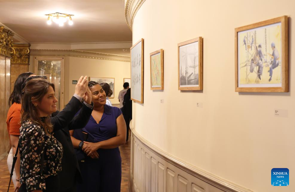 Visitors watch Brazilian paintings at a Chinese-Brazilian calligraphy and painting exhibition at the Municipal Theatre of Rio de Janeiro in Brazil, March 25, 2026. The exhibition, themed on "Horizons in Dialogue," kicked off in Rio de Janeiro on Wednesday. (Xinhua/Jin Haoyuan)