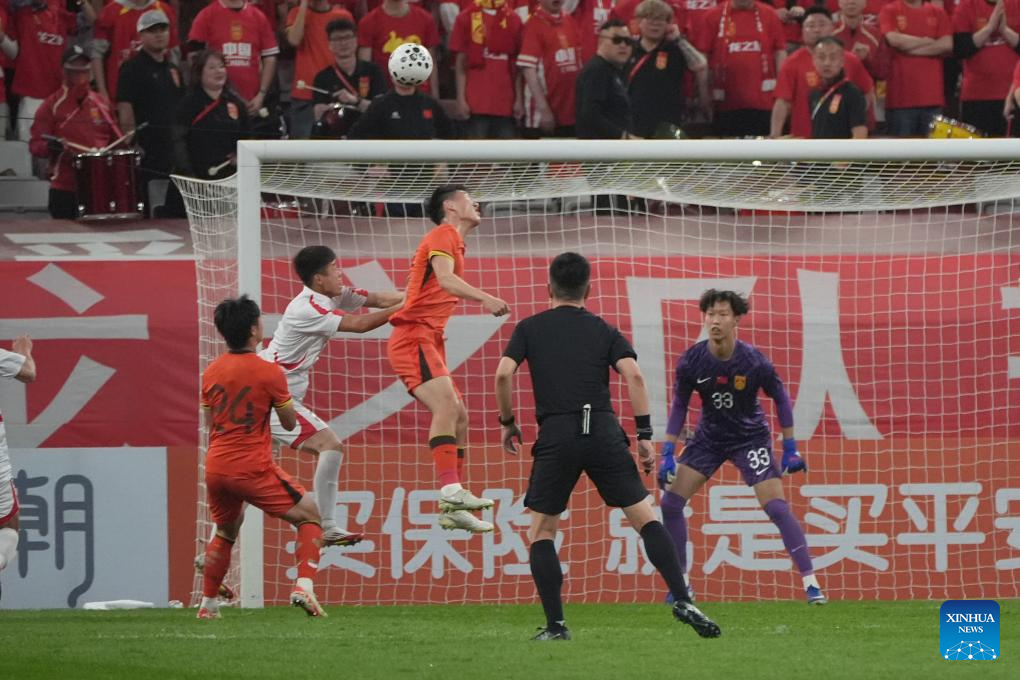 Players of both sides vie for a header during the football match between China U-23 and the Democratic People's Republic of Korea (DPRK) U-23 at 2026 CFA Team China International Youth Tournament in Xi'an, northwest China's Shaanxi Province, March 28, 2026. (Xinhua/Shao Rui)