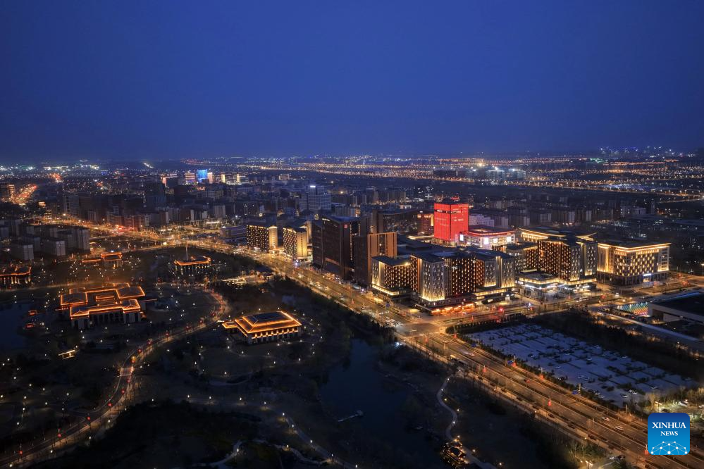 An aerial drone photo taken on March 27, 2026 shows a night view in the Xiong'an New Area in north China's Hebei Province. (Xinhua/Xing Guangli)