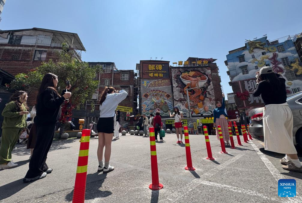 Tourists pose for photos in front of a Luosifen cultural wall in Liuzhou City, south China's Guangxi Zhuang Autonomous Region, March 11, 2026. In Guangxi, rice noodles are served in many different ways, such as Luosifen, Guilin rice noodles, seafood rice noodles, Nanning Laoyou rice noodles and Shengzha rice noodles, with noodle shops found everywhere from busy streets to small lanes. (Photo by Zheng Changhao/Xinhua)