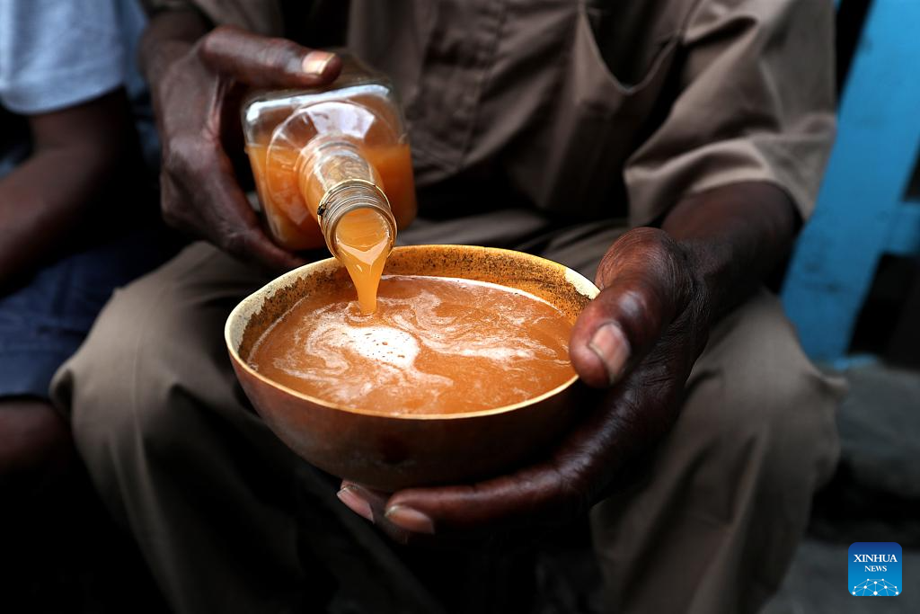 A man drinks dolo in Abidjan, Cote d'Ivoire, Jan. 20, 2026. Dolo, also known as millet beer, is a traditional fermented grain beverage widely consumed in Cote d'Ivoire and several West African countries. Brewed mainly from sorghum or millet, it has a low alcohol content and a mildly sour, slightly sweet taste, and is commonly consumed at community gatherings, weddings and traditional ceremonies. (Photo by Yvan Sonh/Xinhua)