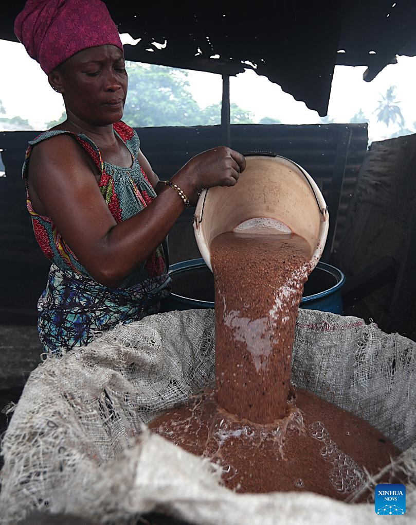 A woman processes dried sorghum to make dolo in Abidjan, Cote d'Ivoire, Jan. 20, 2026. Dolo, also known as millet beer, is a traditional fermented grain beverage widely consumed in Cote d'Ivoire and several West African countries. Brewed mainly from sorghum or millet, it has a low alcohol content and a mildly sour, slightly sweet taste, and is commonly consumed at community gatherings, weddings and traditional ceremonies. (Photo by Yvan Sonh/Xinhua)
