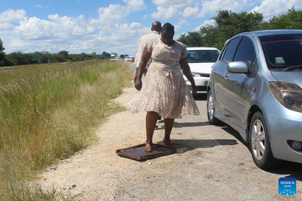 A woman sanitizes her shoes at a disease control station along the road of Francistown-Jackalas I Village in North East District, Botswana, Feb. 1, 2026. Botswanan veterinary authorities on Sunday confirmed an outbreak of foot-and-mouth disease (FMD) at a village in the northeastern part of the southern African country, near the border with Zimbabwe. (Photo by Shingirai Madondo/Xinhua)