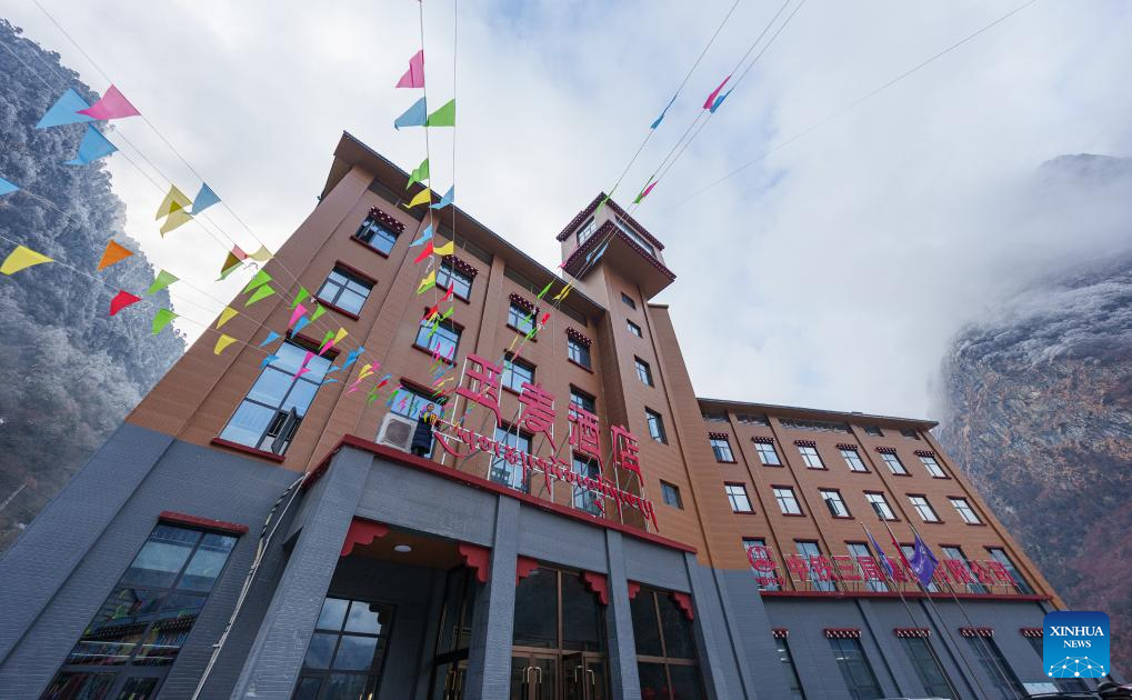 Colorful flags are hoisted outside a hotel to celebrate the upcoming Spring Festival and Tibetan New Year in Yumai Town of Lhunze County in Shannan City, southwest China's Xizang Autonomous Region, Feb. 5, 2026. Yumai Town, located on the southern foot of the Himalayas, was once home to merely three permanent residents due to its harsh and rugged terrain. Today, residential houses here are neatly arranged, with comprehensive infrastructure including drainage and communication facilities in place.