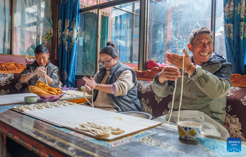 Villagers make traditional snacks for the upcoming Tibetan New Year at home in Yumai Town of Lhunze County in Shannan City, southwest China's Xizang Autonomous Region, Feb. 5, 2026. Yumai Town, located on the southern foot of the Himalayas, was once home to merely three permanent residents due to its harsh and rugged terrain. Today, residential houses here are neatly arranged, with comprehensive infrastructure including drainage and communication facilities in place.