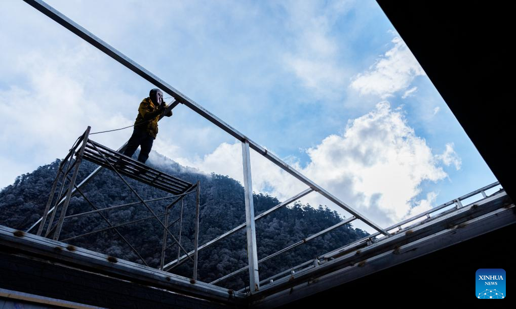 A villager welds the steel framework for the ceiling of a residence in Yumai Town of Lhunze County in Shannan City, southwest China's Xizang Autonomous Region, Feb. 5, 2026. Yumai Town, located on the southern foot of the Himalayas, was once home to merely three permanent residents due to its harsh and rugged terrain. Today, residential houses here are neatly arranged, with comprehensive infrastructure including drainage and communication facilities in place.