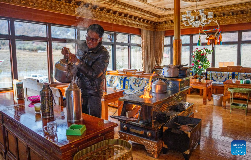 A villager works at his home-stay in Yumai Town of Lhunze County in Shannan City, southwest China's Xizang Autonomous Region, Feb. 5, 2026. Yumai Town, located on the southern foot of the Himalayas, was once home to merely three permanent residents due to its harsh and rugged terrain. Today, residential houses here are neatly arranged, with comprehensive infrastructure including drainage and communication facilities in place.