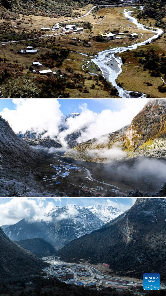 This combo photo shows the views of Yumai Town in Lhunze County of Shannan City, southwest China's Xizang Autonomous Region separately taken on Oct. 26, 2003 (top, photo by Xinhua photographer Sonam Norbu), Oct. 31, 2017 (middle, photo by Xinhua photographer Purbu Zhaxi), and Feb. 5, 2026 (bottom, drone photo by Xinhua photographer Tenzin Nyida). Yumai Town, located on the southern foot of the Himalayas, was once home to merely three permanent residents due to its harsh and rugged terrain. Today, residential houses here are neatly arranged, with comprehensive infrastructure including drainage and communication facilities in place.