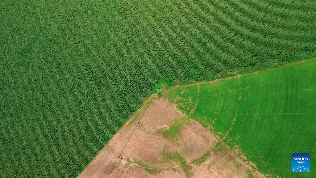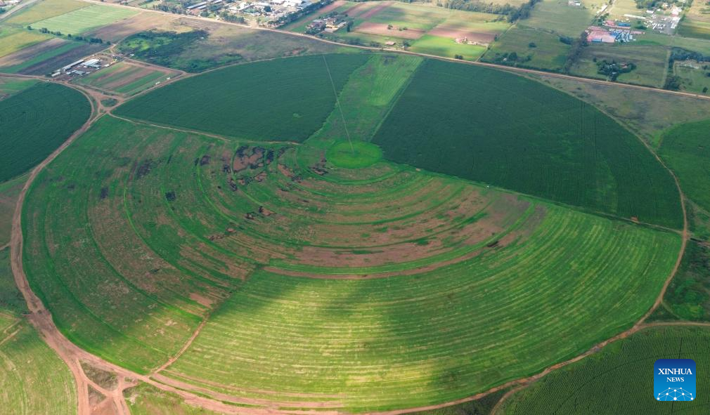 An aerial drone photo taken on March 27, 2026 shows a center-pivot irrigation equipment on a circular field in the suburb of Johannesburg, South Africa. (Xinhua/Chen Wei)