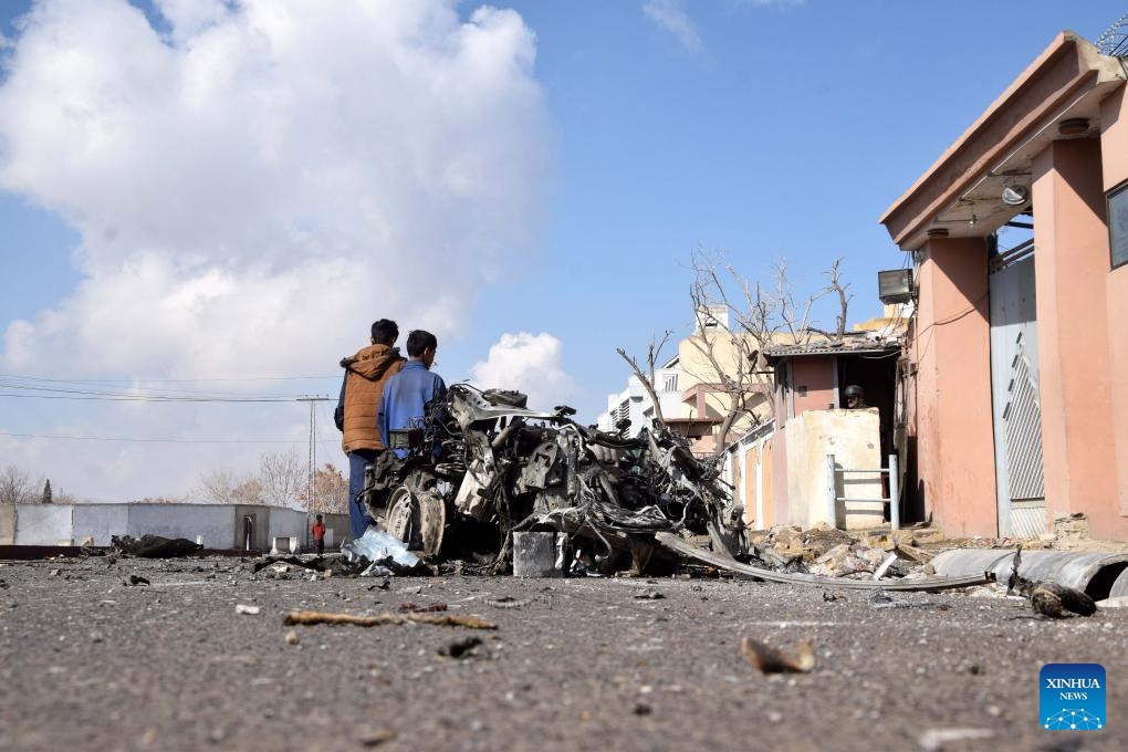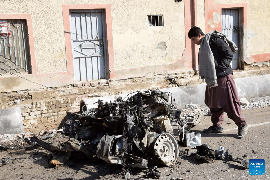 Locals walk past the wreckage of a destroyed vehicle at the site of an attack in southwest Pakistan's Quetta on Jan. 31, 2026. (Photo by Asad/Xinhua)