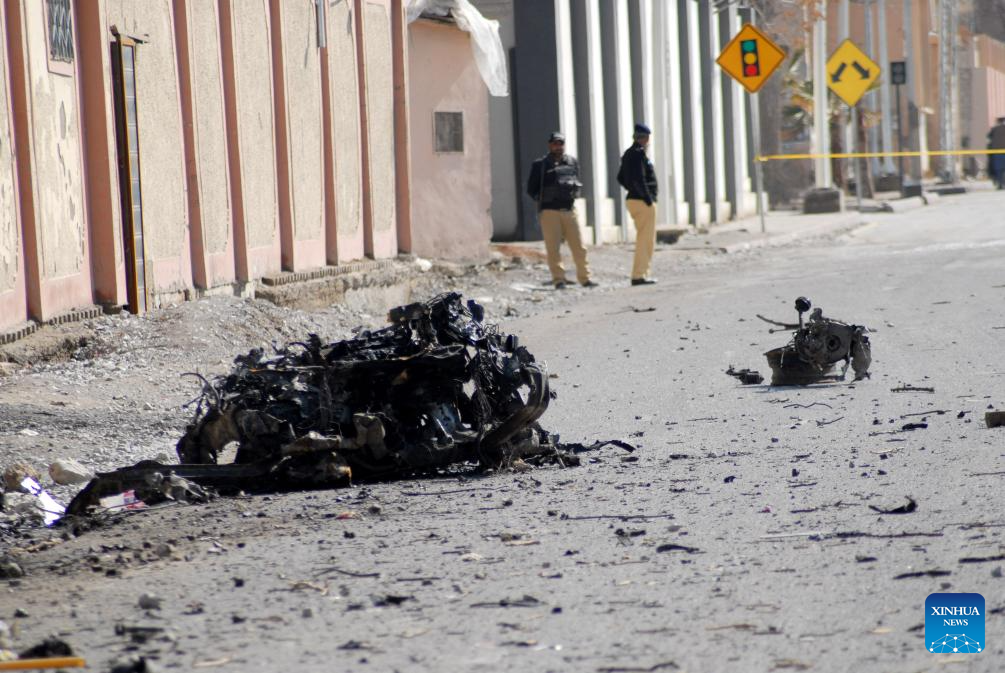 Wreckage of a destroyed vehicle is seen at the site of an attack in southwest Pakistan's Quetta on Jan. 31, 2026. Pakistani security forces and law enforcement agencies have "successfully thwarted the evil design of terrorists," killing 92 terrorists in the country's southwestern Balochistan province on Saturday, the military said in a statement. (Photo by Asad/Xinhua)