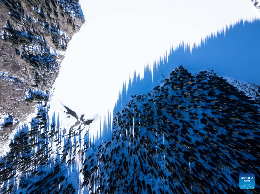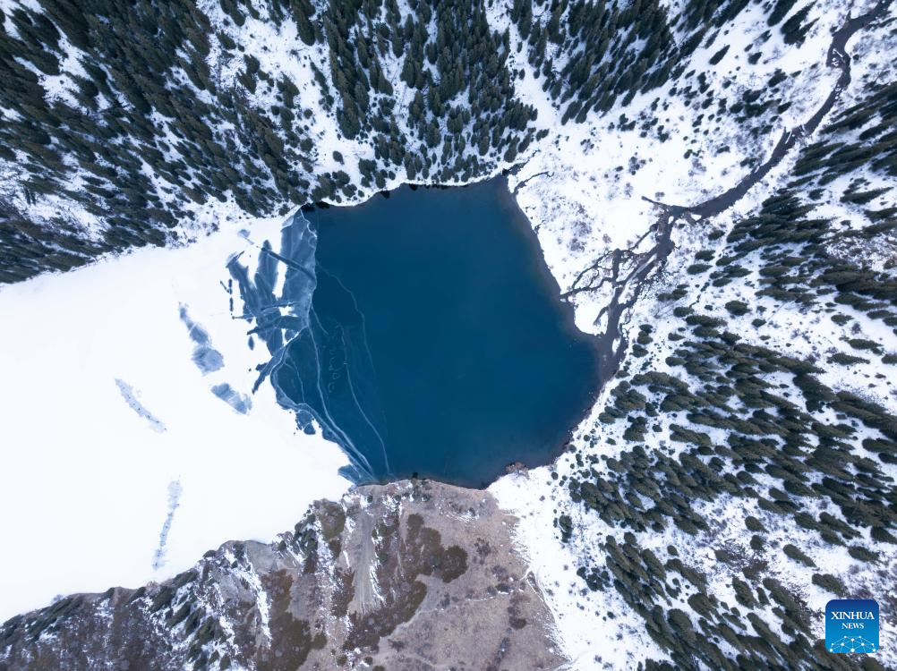 This aerial drone photo taken on Jan. 31, 2026 shows a view of the Kolsai Lakes National Park in Almaty Region, Kazakhstan. (Xinhua/Li Renzi)