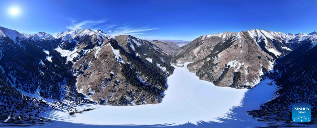 This aerial drone panoramic photo taken on Jan. 31, 2026 shows a view of the Kolsai Lakes National Park in Almaty Region, Kazakhstan. (Xinhua/Li Renzi)