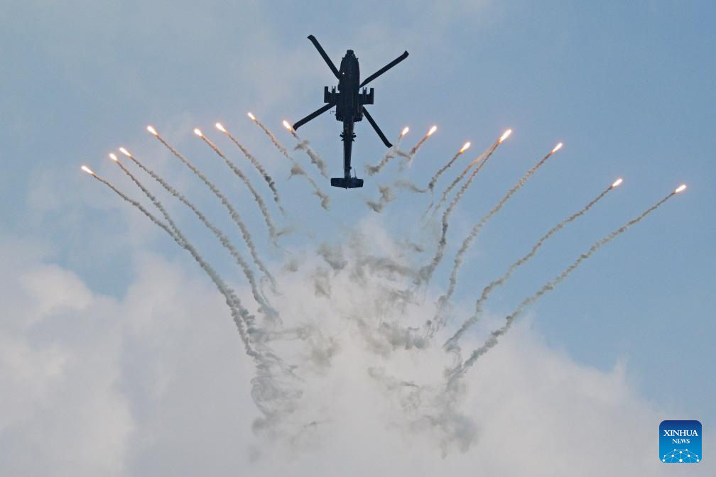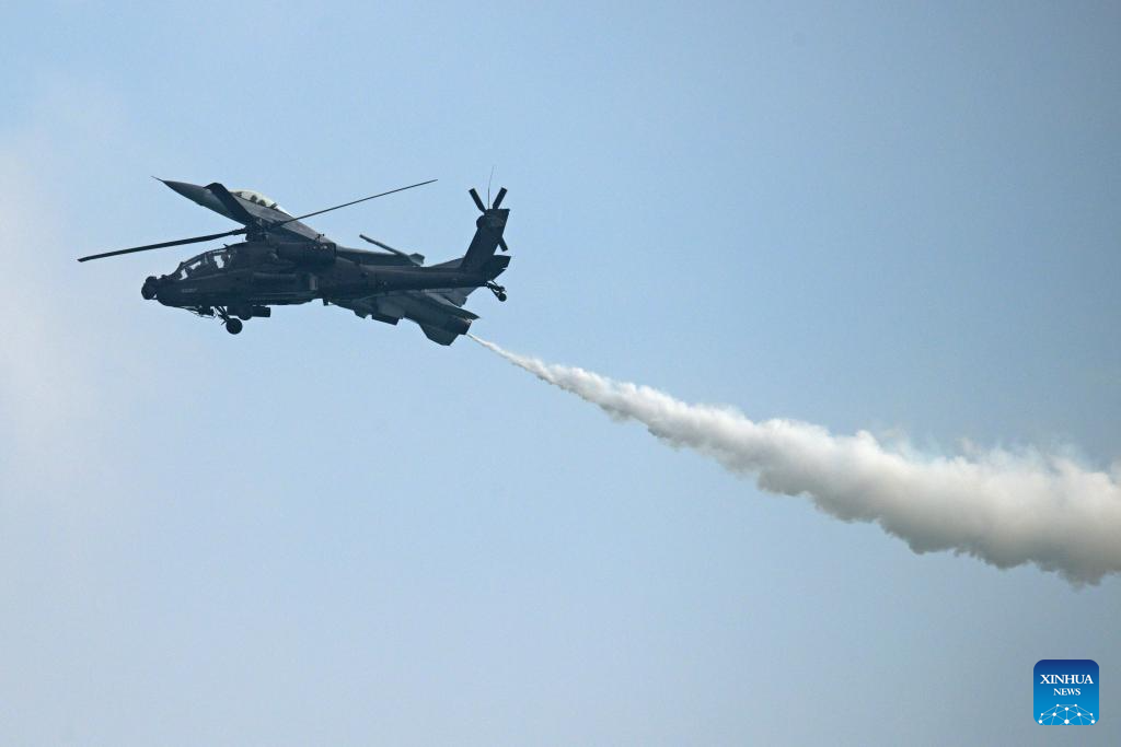 A Republic of Singapore Air Force (RSAF) AH-64D Apache helicopter performs during the media preview for the 10th Singapore Airshow in Singapore, Feb. 1, 2026. The airshow will be held from Feb. 3 to 8 in Singapore. (Photo by Then Chih Wey/Xinhua)