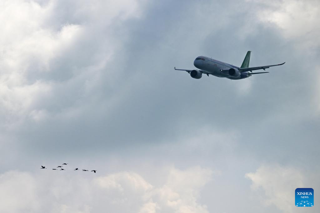 A Commercial Aircraft Corporation of China (COMAC) C919 performs during the media preview for the 10th Singapore Airshow in Singapore, Feb. 1, 2026. The airshow will be held from Feb. 3 to 8 in Singapore. (Photo by Then Chih Wey/Xinhua)