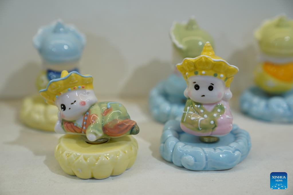 Cultural and creative products inspired by the "Speechless Buddha" are pictured at Zeng Rui's studio in Jingdezhen, east China's Jiangxi Province, March 12, 2026.(Xinhua/Zhou Mi)