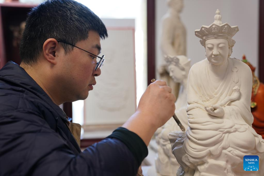 Zeng Rui works on a porcelain sculpture at his studio in Jingdezhen, east China's Jiangxi Province, March 12, 2026. A porcelain sculpture of arhat, housed in the Jingdezhen China Ceramics Museum, has gained Internet fame after netizens nicknamed it the "Speechless Buddha" for its endearingly charming expression. The artwork was created over 80 years ago by Zeng Longsheng, a master of Chinese porcelain art who established a long-standing family reputation for porcelain sculpture.
