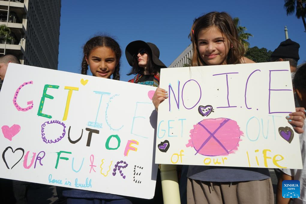 People attend a rally in front of the Los Angeles City Hall, in Los Angeles, California, the United States, Jan. 31, 2026. Multiple demonstrations were held on Saturday across Southern California against enforcement raids by U.S. Immigration and Customs Enforcement (ICE). (Photo by Zeng Hui/Xinhua)