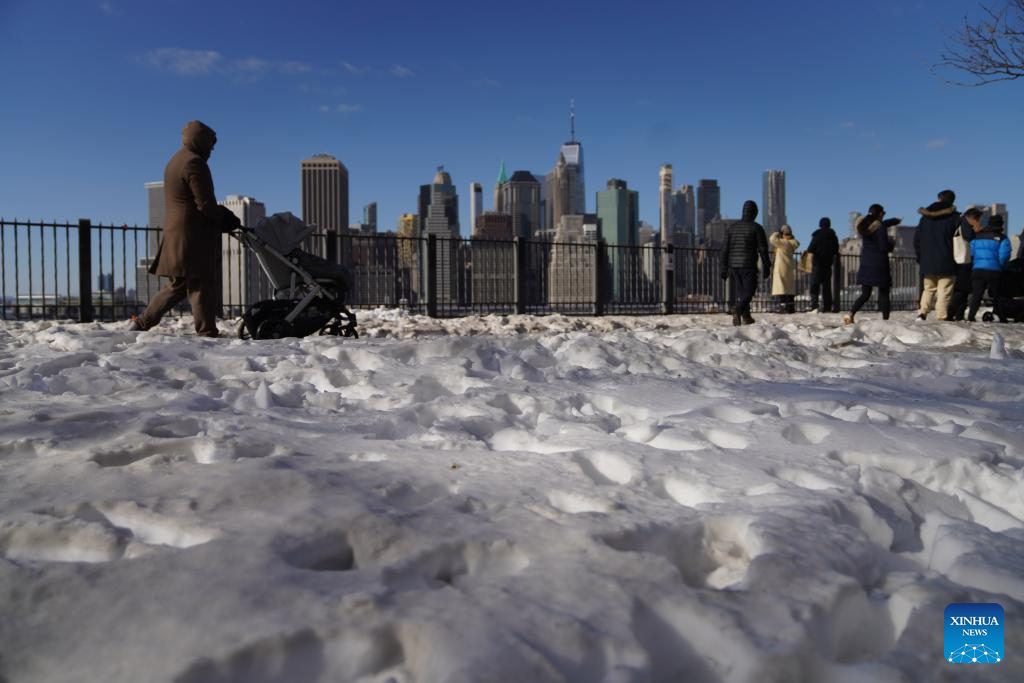 Pedestrians walk past snow accumulation in New York, the United States, Jan. 31, 2026. In the final week of January, a powerful winter storm swept across much of Canada and the United States, bringing widespread snow, sleet, and freezing rain, along with life-threatening cold and ice. (Xinhua/Zhang Fengguo)