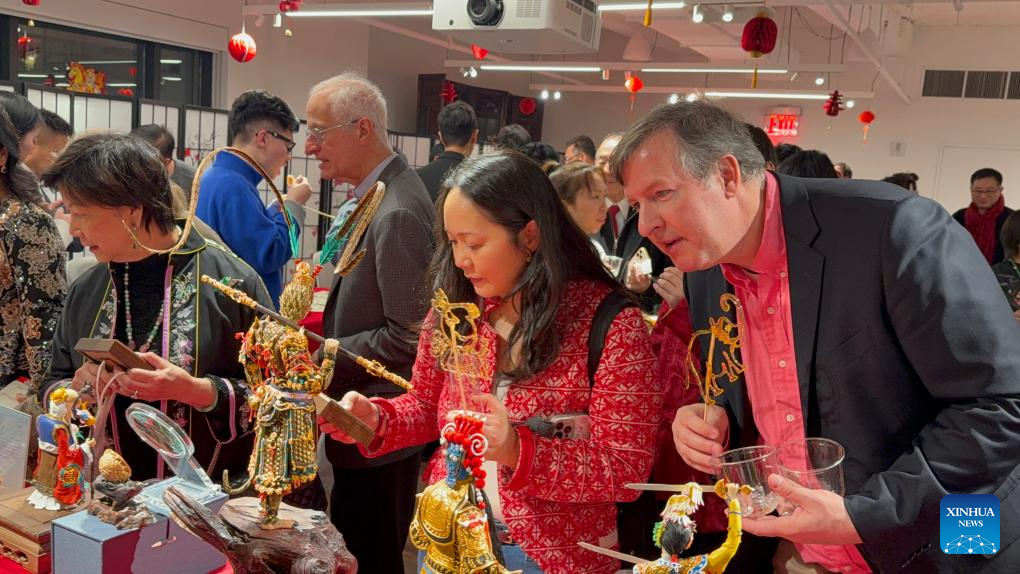 Guests view traditional Chinese artifacts before a Chinese New Year banquet held in Lower Manhattan, New York City, the United States, on Feb. 9, 2026. (Photo by Vivien Liu/Xinhua)