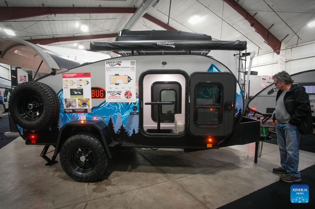 A man looks at a pop-up camper at the 2026 Earlybird RV (recreational vehicles) Show & Sale in Abbotsford, British Columbia, Canada, on Feb. 19, 2026. The four-day event kicked off here on Thursday. (Photo by Liang Sen/Xinhua)