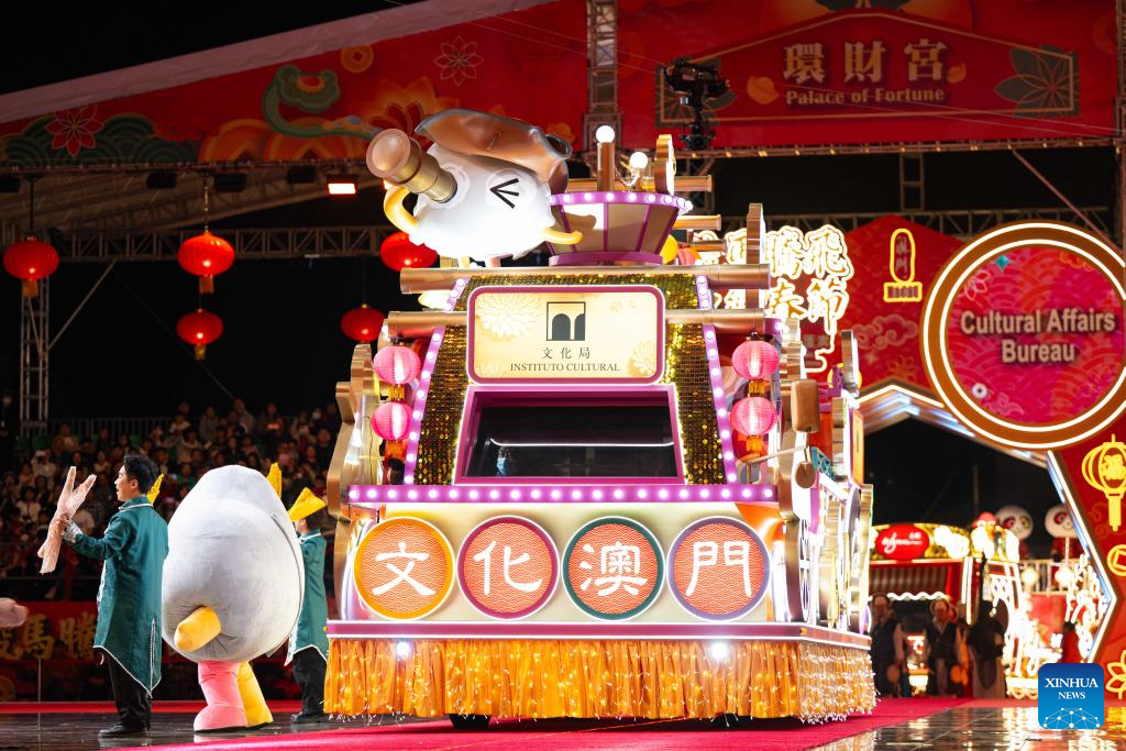 A float is pictured during a parade in celebration of the Chinese New Year in Macao, south China, Feb. 19, 2026. A parade was held Thursday by the Macao Government Tourism Office to celebrate the Chinese New Year, or the Spring Festival. (Xinhua/Cheong Kam Ka)