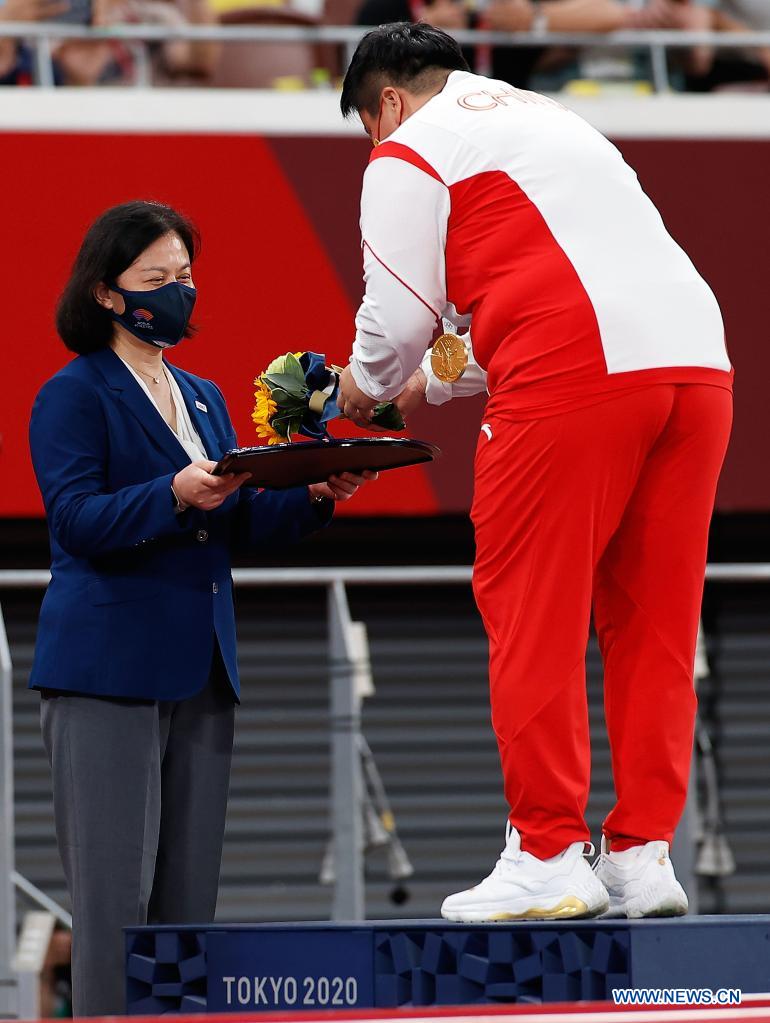 Gong Lijiao of China reacts during the awarding ceremony of the Women's Shot Put at the Tokyo 2020 Olympic Games in Tokyo, Japan, Aug. 1, 2021. (Xinhua/Li Ming)